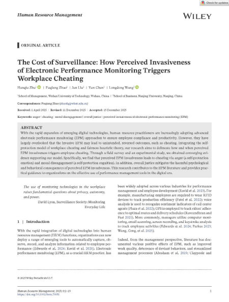 近日,我院组织与人力资源管理系赵富强教授战略人力资源管理团队博士生祝含秋以第一作者身份在人力资源管理领域顶级学术期刊Human Resource Management上在线发表论文“The Cost of Surveillance: How Perceived Invasiveness of Electronic Performance Monitoring Triggers Workplace Cheating”。该论文由赵富强教授担任通讯作者。