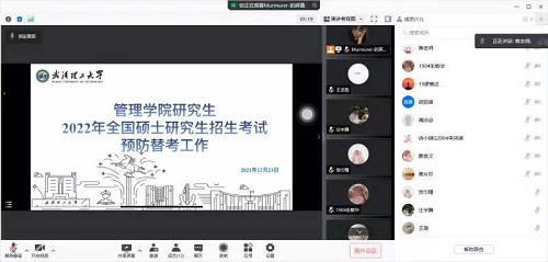 12月23日晚,必赢3003no1线路检测中心辅导员曾珠主持召开了必赢3003no1线路检测中心研究生2022年全国研究生招生考试防替考工作大会的线上会议,各班班长作为代表参加此次会议。曾珠老师带领大家学习了关于防替考的相关资料后,将具体工作安排传达给各位班长。具体工作包括12月24日和25日晚进行全院的查寝工作;12月25日上午9: 00以班级为单位展开腾讯会议点名两项工作。