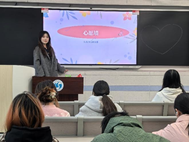 活动中,团员们踊跃提笔,在彩纸上郑重写下对未来的期许:有的同学立志深耕人力资源管理专业,未来在企业人才发展中贡献力量;有的同学希望持续参与志愿服务,在奉献中传递温暖;有的同学专注于学业提升,计划通过刻苦学习争取深造机会;还有同学心怀基层,渴望毕业后到一线服务,在实践中担当使命。一张张承载个人志向的便签被仔细粘贴,汇聚成一面多彩的“青春心愿墙”。同学们驻足墙前,相互交流分享,在沟通中进一步明晰了前进方向。