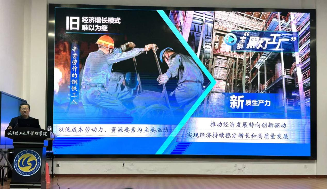 童泽望系统解读新质生产力的科学内涵、时代意义与培育路径,围绕比亚迪、宝钢、振华重工等企业案例,直观展现新质生产力在科技自立自强、产业转型升级中的推动作用。结合学校学院办学特色,他指出,新质生产力发展需要创新型管理人才作支撑,学院也将不断调整课程体系与培养方案,精准赋能管院学子成长为适配数字经济、绿色低碳领域的新时代商科人才。最后,他鼓励研究生把握当前新质生产力迅猛发展的时代机遇,将个人科研学习与国家发展需求结合,为推进中国式现代化建设贡献青春力量。