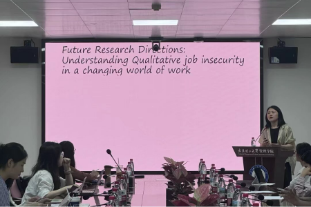 讲座伊始,蒋教授指出工作不安全感对员工身心健康、工作态度及组织绩效存在广泛负面影响,结合《管理学会年鉴》研究,探讨缓解或加剧其负面效应的关键调节变量,系统阐释资源威胁理论等五大核心理论视角的竞争性预测,论证量化与质化工作不安全感的差异化调节机制,提供全新理论框架。