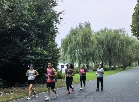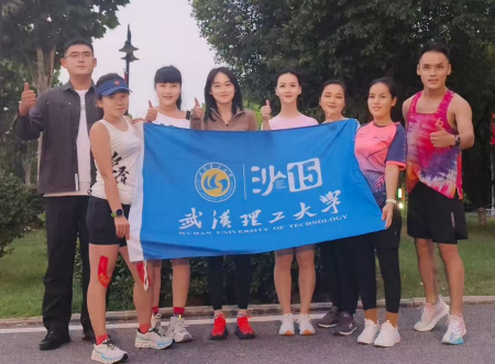 10月3日同样于东湖边6:00开跑,沙赛组委会刘凤小姐姐从西安远道而来专程陪跑,带领队员进行专业拉伸。在经充分热身后队员们举着印有"必赢线路检测3003"校徽的蓝色旗帜,在东湖边合影留念,形成清晨最靓丽的风景线。